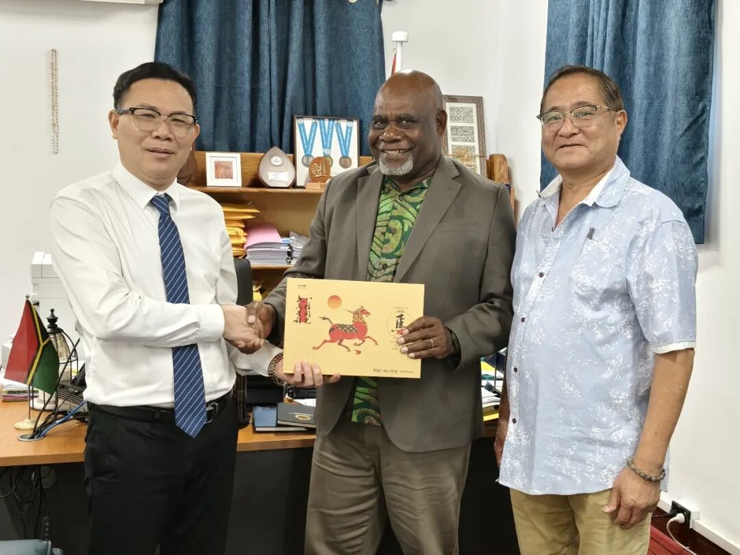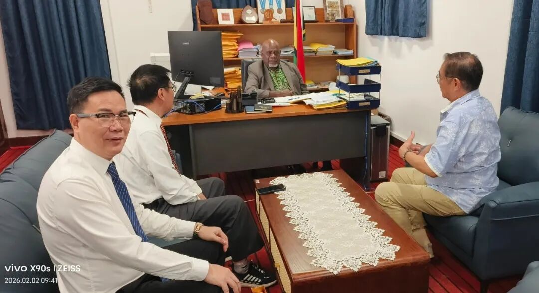 2026年2月2日,正值丙午马年新春将至之际,广西智慧城市研究会会长、广西数字贸易产业协会执行会长、逐鹿书院总经理吴海斌先生,广西民族大学乡村振兴研究院副院长韦广文先生一行,在瓦努阿图驻广州总领事吴植佳先生的陪同下,于瓦努阿图共和国首都维拉港拜访了该国教育与培训部长西米尔·约翰逊阁下(Simil Kalptu Johnson Youse)。此次会晤以茶为媒、以育为桥,汇聚广西政企校多方力量,不仅促成了中瓦汉语教育合作的重要突破,更将两国跨越山海的友谊推向新高度。